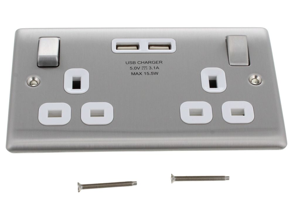 - Name: BG BRUSHED STEEL 13A 2 GANG SWITCHED SOCKET + USB - WHITE SURROUND